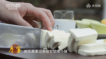 4.将豆腐切成小块,放到锅里,一边搅拌一边把豆腐捏碎。捏得越碎,卷出来的口感会越好。吃起来会有蒜瓣儿肉的感觉。