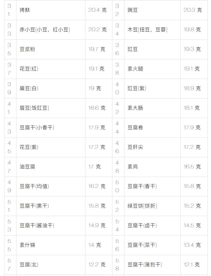 我在网上看到一张豆类及其制品的蛋白质含量表,在此也分享给诸位。