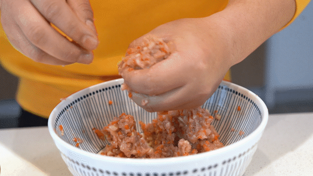 5.挤肉圆:可以将搅拌好的食材抓取一些在手心,轻捏挤出一颗颗大小相近的丸子,备用。