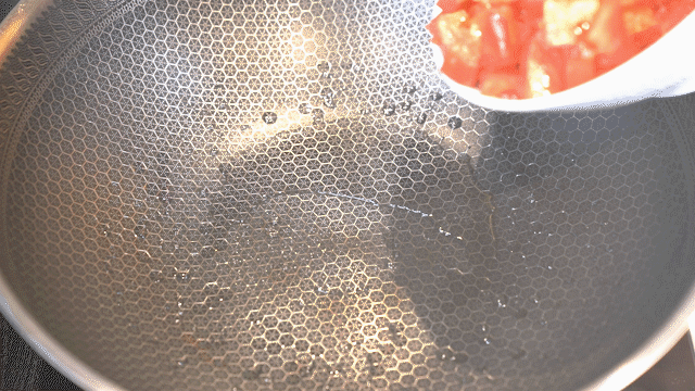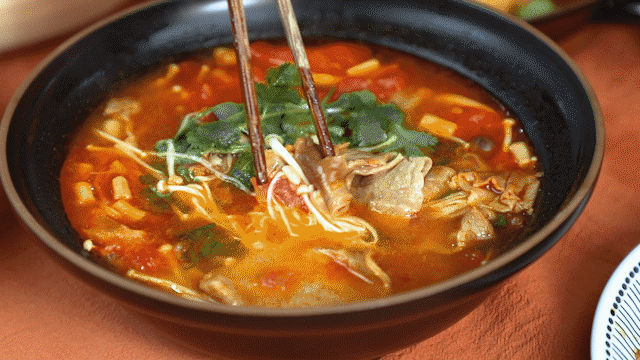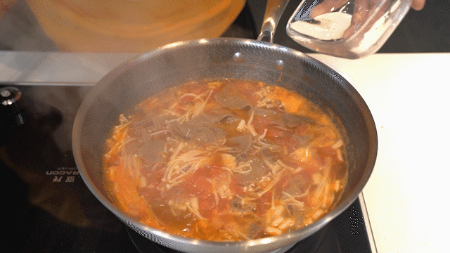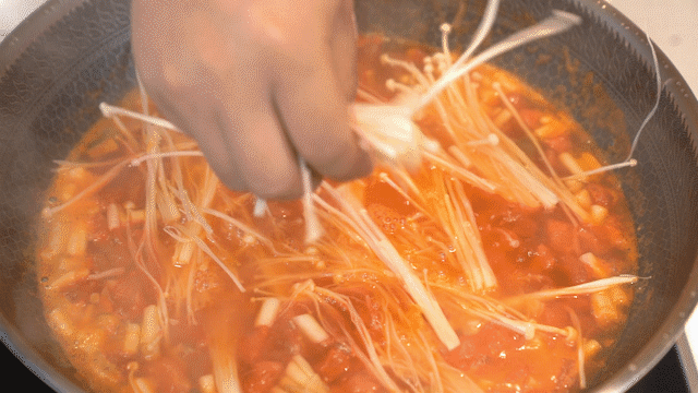 5.盖上锅盖等煮到番茄都已融入汤汁时,放入金针菇和素牛肉片后再煮开。