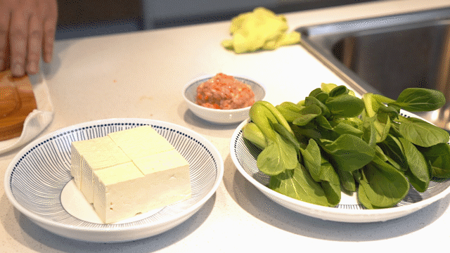 6.将青菜焯水,加入少许盐和油,捞出后放入碗底装饰,将豆腐放在上面。