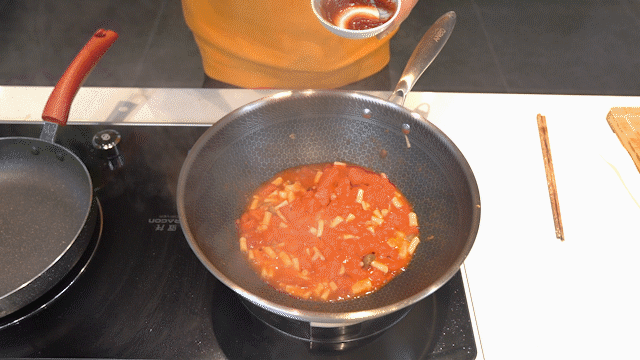 4.调味:加入番茄酱、金辣椒酱、5小勺白醋,再加入水,最后加入盐和蘑菇精各2小勺。