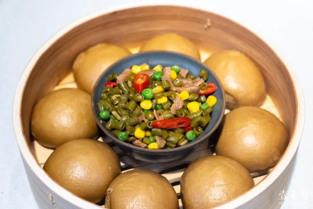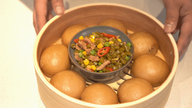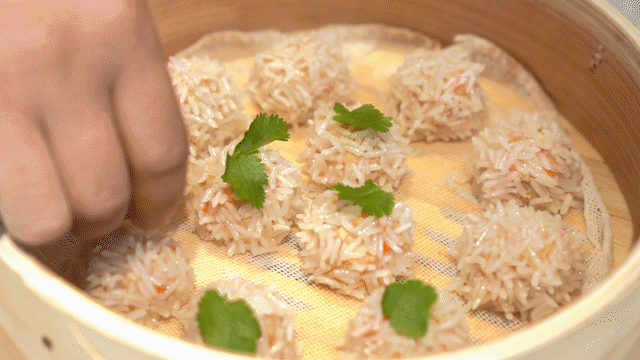 7.将裹米后的肉圆放入蒸笼,上锅蒸15分钟后出锅。