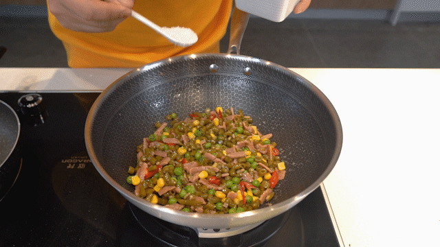 3.起油锅,放入切好的食材,最后放入青豆、玉米一起炒香。