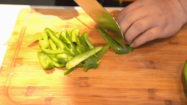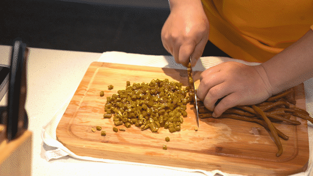 2.在等待的过程中,可以做切配准备:将酸豇豆、辣椒、肉丝都切成小丁备用。