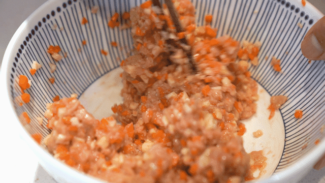 3.将切好的胡萝卜和笋与新膳肉都倒入碗中,放入少许盐和蘑菇精。