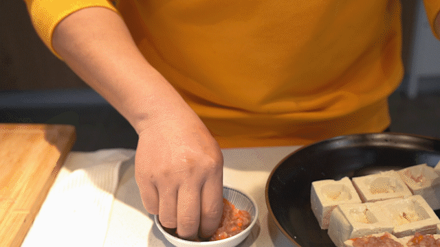 1.将豆腐切成大方块,用小刀在切好的豆腐块中间挖一个洞。