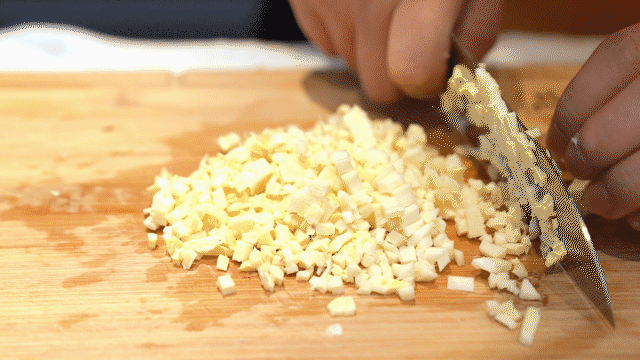 2.切配准备:将笋和胡萝卜切成小丁,之后将切好的笋焯水,备用。