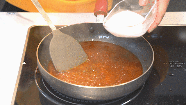 5.调汁:在锅底留一些油,加入2勺番茄酱、1小碗水,烧开后放入煎好的豆腐,加2小勺生抽、少许老抽、糖、蘑菇精,调味。