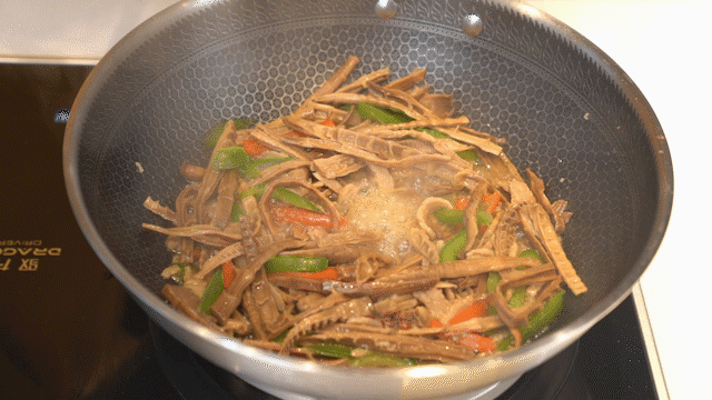 3.开火:先放入肉丝和青椒、红椒,最后放入笋干一起炒。然后加入一小碗水。