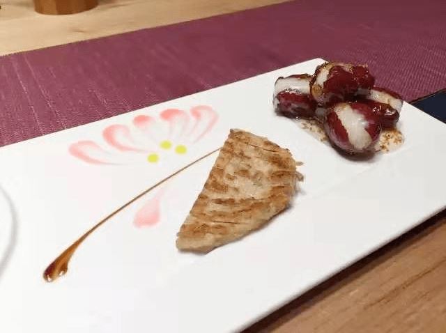 第一道:琴心三叠,配以百香果、冰草、大豆蛋白食之清爽,果然是开胃的好菜。