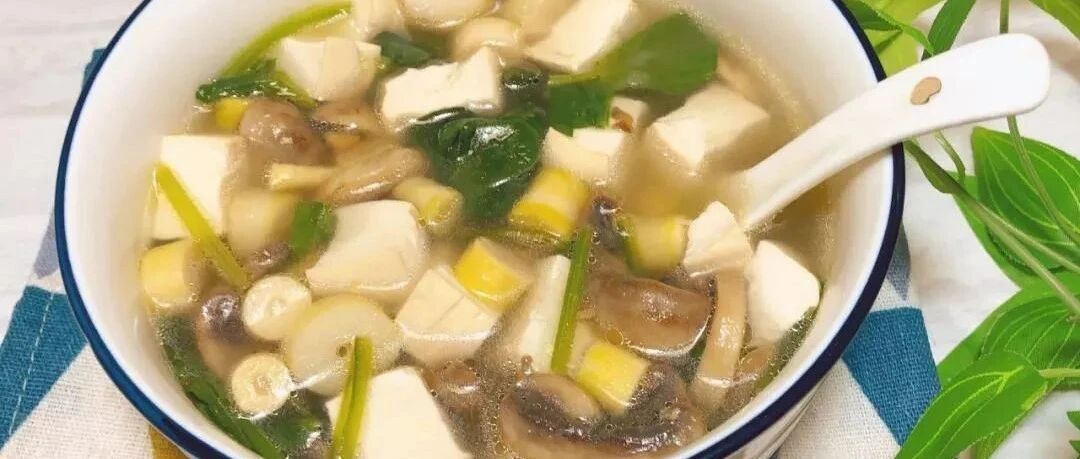 1.食材洗净。豆腐、竹笋、草菇切成小丁,绿菜叶切段。