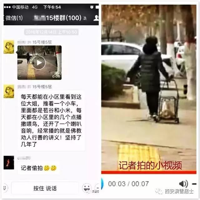 她曾在施食的路上,被小区的一位住户(他是省电视台的记者)拍了照片和小视频,发到了小区微信群里: