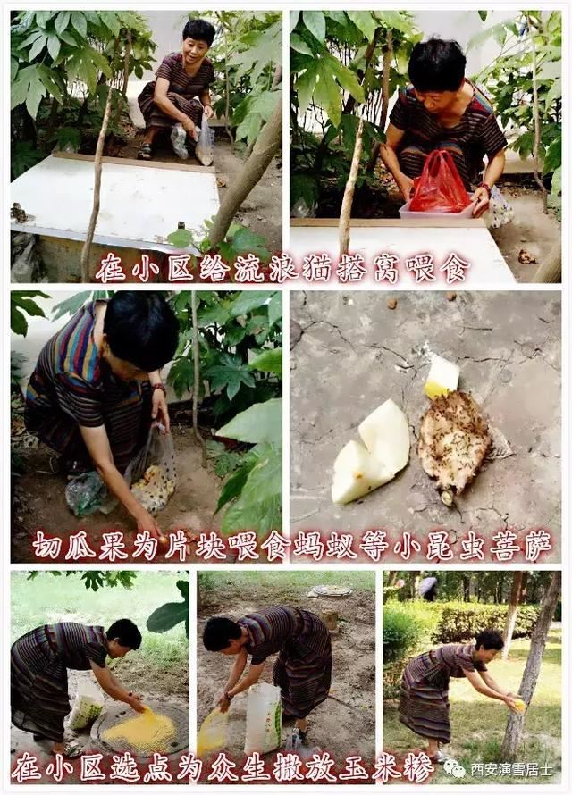 7、当她从菜市场出来以后,回家路过餐饮街,看到那些吃不完,被扔在桌上、地上的各种食物时,她就一一将它们捡起,然后再分别喂给流浪狗、流浪猫、麻雀、喜鹊、鸽子等众生。