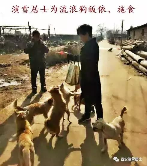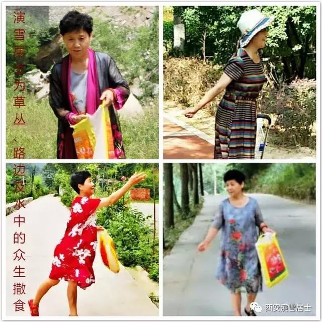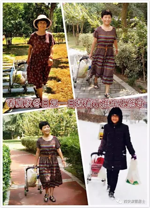 3、做完早课以后,她就拉着装有玉米糁、狗粮、猫粮(这些猫狗粮中的众生都已经超度,玉米糁也经过加持)的小推车,一边听上净下空老法师讲《大乘无量寿庄严清净平等觉经》,一边给众生施食。给小区以及周边地区和路遇的流浪狗、流浪猫、麻雀、喜鹊、鸽子、斑鸠和各种的小昆虫菩萨们喂食。不管是炎热酷暑的夏季,还是冰冻三尺寒冷的冬天,或者是各种节假日,包括过年过节她都没停下。当家家户户举家团圆的时候,她还是依然坚持做着同样的事,从不间断。