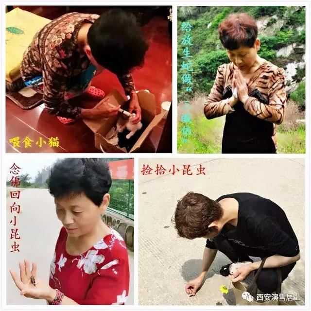 9、她每天都是把众生喂完以后才吃第一餐,基本上都在中午十二点以后,有时甚至到了中午两、三点以后。她的心里只有众生,没有自己,众生不吃她就吃不下,只有把它们安顿好了,她才能吃下去。有好多次过了饭点很久,家人和居士们问她吃过中午饭了没有?她回答:“让我想一想。”想完之后才反应过来,自己今天还没有吃一餐呢。