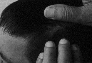 图六,在图五中所述的男孩头部前侧的大的不规则的胎记。这个胎记对应这个男孩所记得生平的男人身上的枪伤出口。(图片来源:childpastlives)