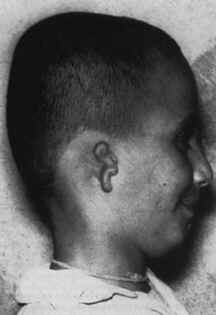 图八,一位土耳其男孩严重变形的耳朵(小耳)。他说他记得一个男人的生平,那个男人被近距离发射的霰弹击伤右侧头部而死亡。(图片来源:childpastlives)