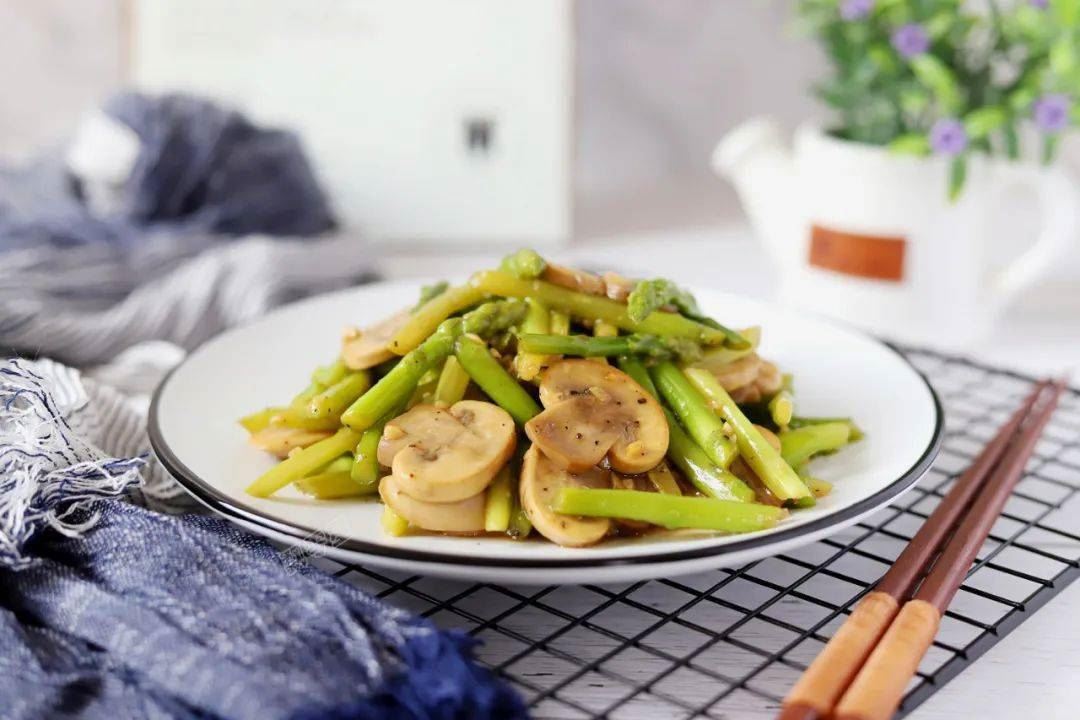 4.等芦笋微微变色,就把口蘑加进去,继续翻炒;
