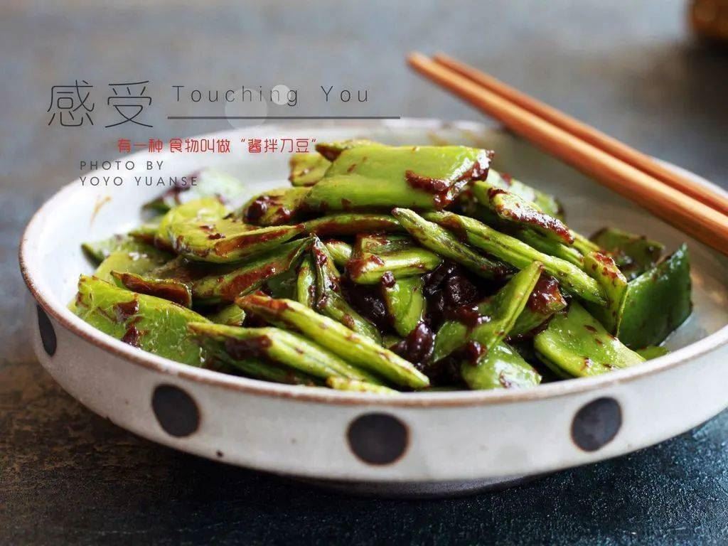 3.起油锅,大火,加入刀豆,炸至稍微起皮;