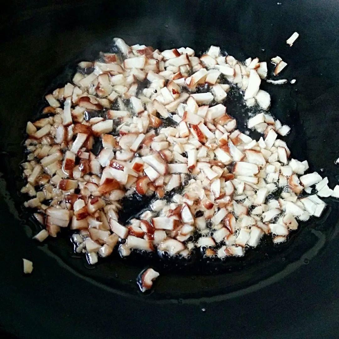 4.锅中适量油,烧至7成热,放入香菇丁,煸炒一下。