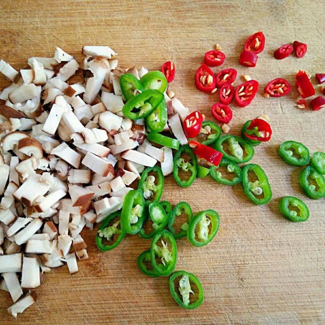2. 香菇洗净切小丁,越小越好;杭椒和小米辣洗净切圈。