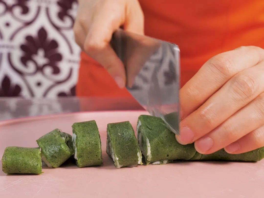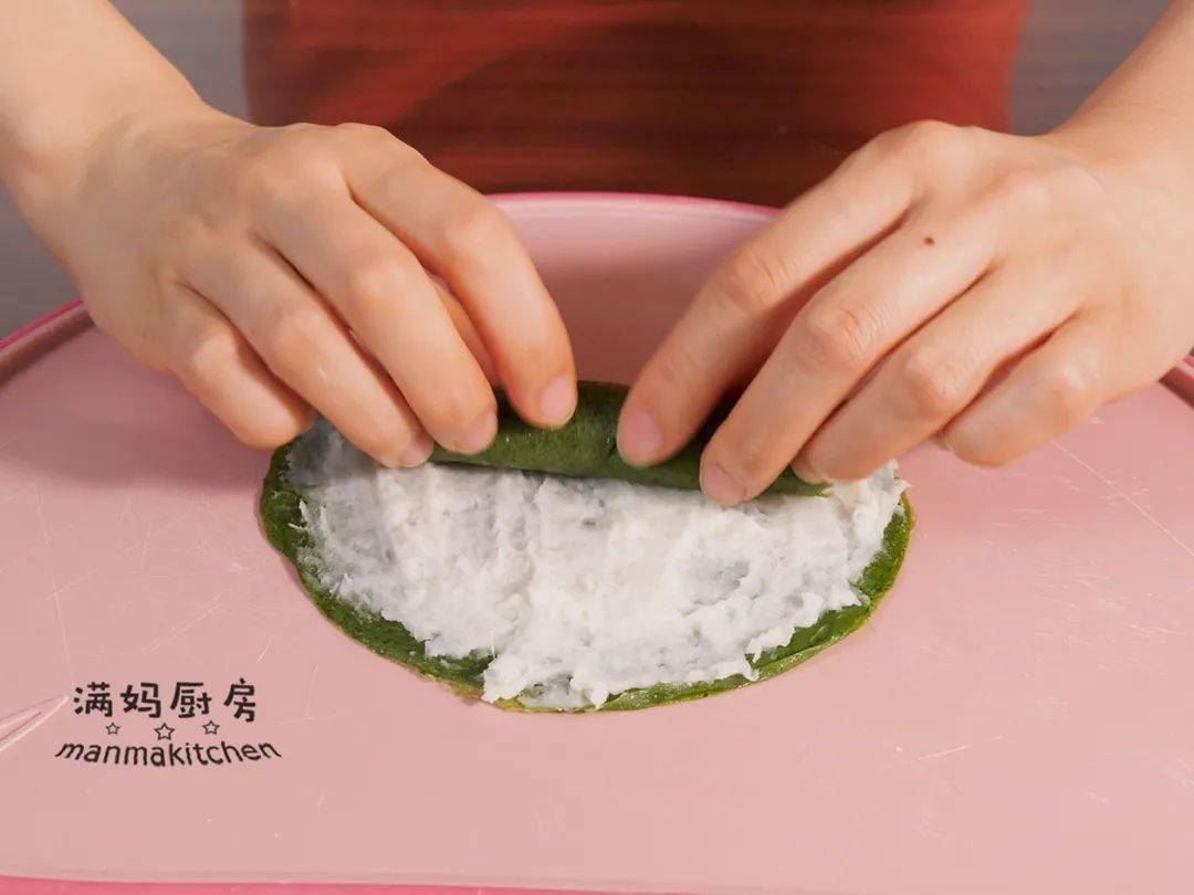 ⑨把山药泥抹在薄饼上,卷成卷,切成合适的大小;