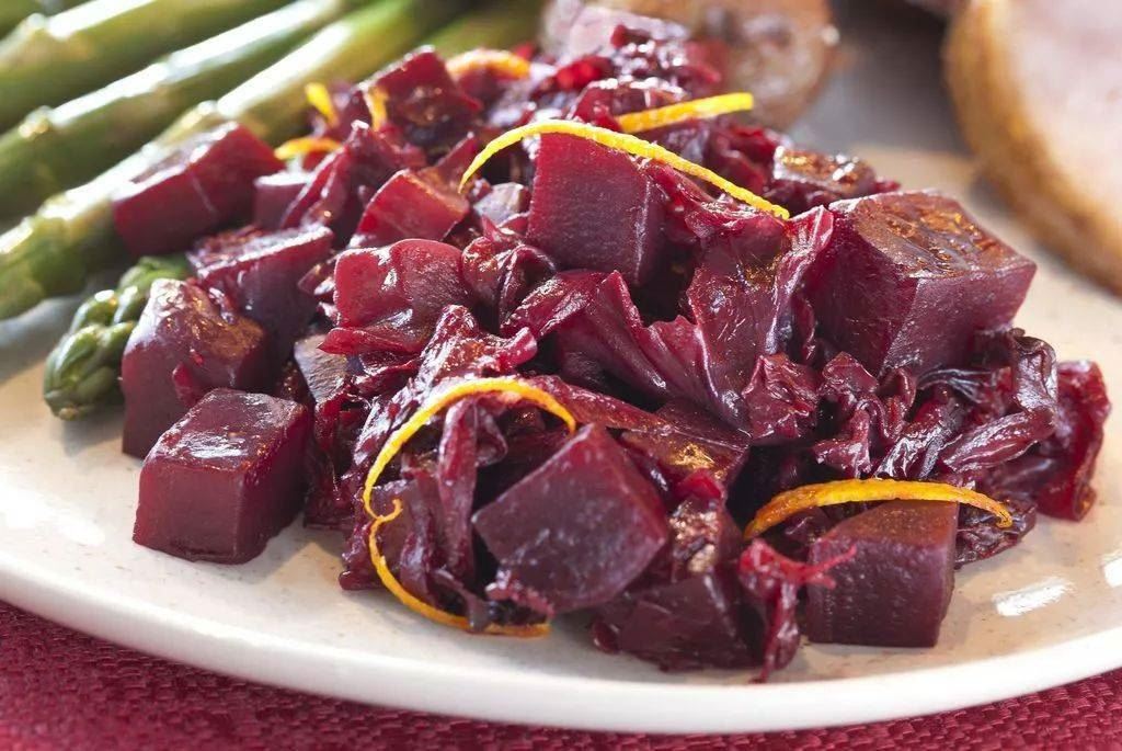 1.甜菜根削皮并切成丁,紫甘蓝切小厚片,辣椒切条;