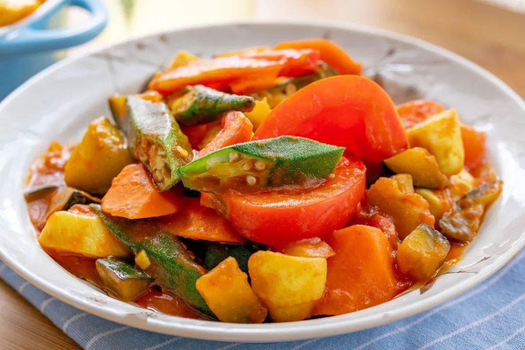 1. 番茄切成小片;胡萝卜、茭白、贝贝南瓜洗净切小块,秋葵切丁;