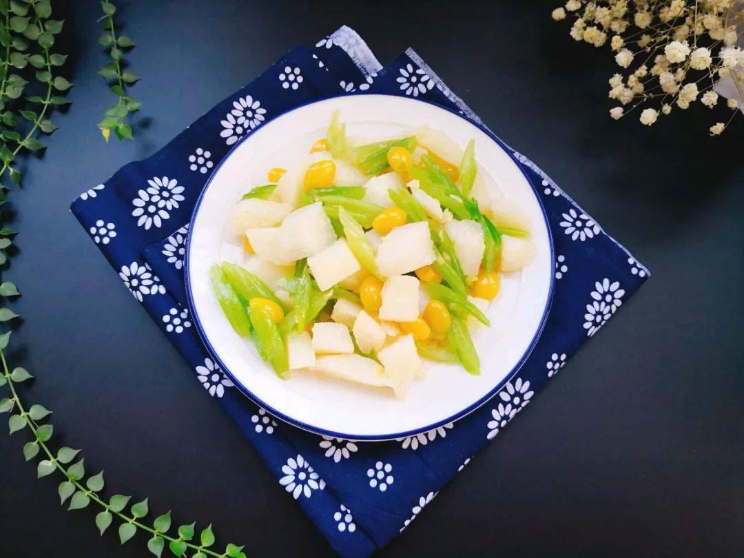 3. 最后放玉米粒、青豌豆,撒一点盐、花生油;