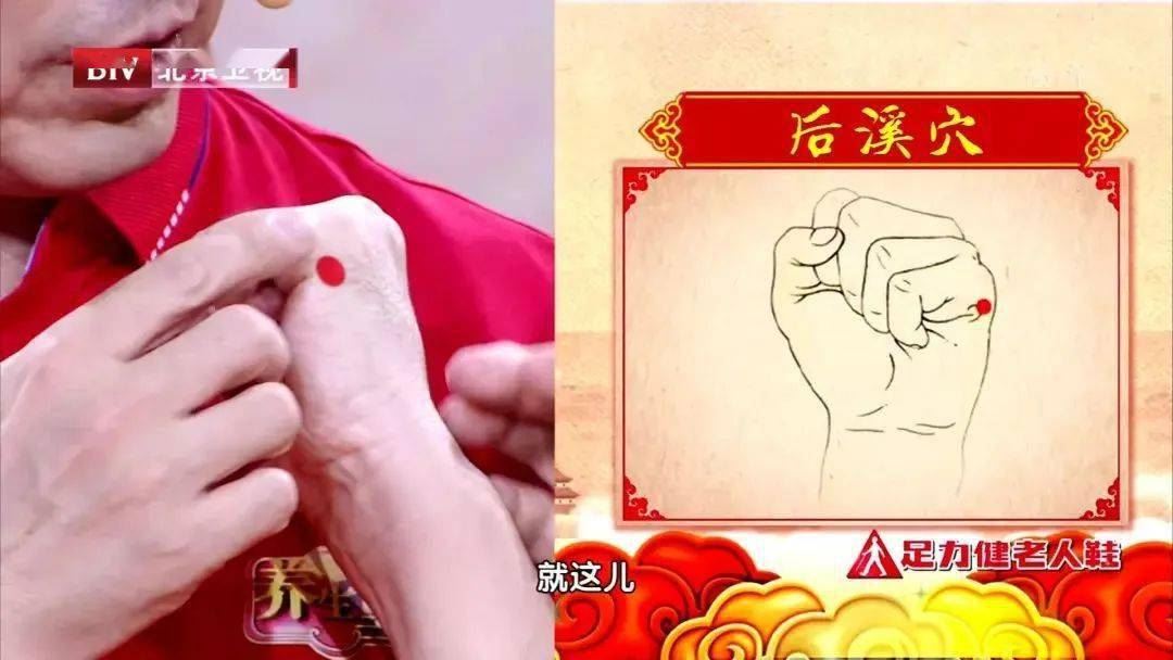 【后溪穴】微握拳,在第五掌指关节下的凹陷处。