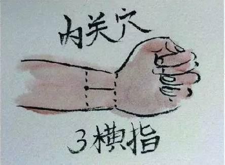 【取穴】伸开上臂,在前臂前区,从腕横纹同上量3横指,两条索状筋之间,即是内关穴。