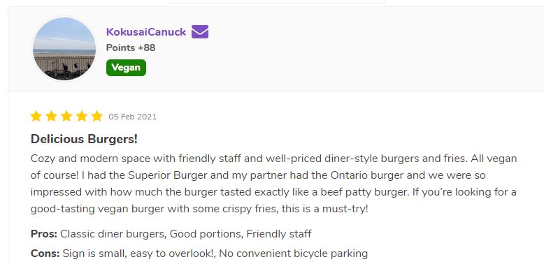 舒适和现代的空间,友好的员工和合理的价格。晚餐是汉堡和薯条,当然都是纯素的!我吃了“高级汉堡”,我的搭档吃了“安大略汉堡”,这个汉堡尝起来和肉饼一模一样,让我们印象深刻。如果你正在寻找美味的素食汉堡和一些酥脆的薯条,必须来这里尝试一下!