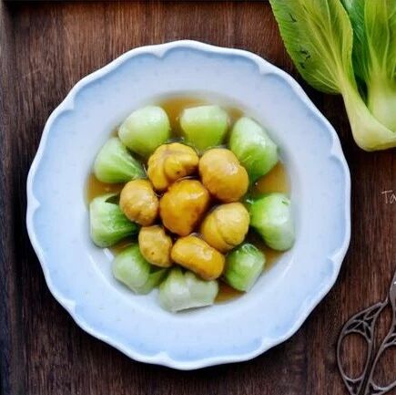 1. 在板栗上划十字花刀,放在烤箱中180度烤10分钟拿出来去壳。2. 锅中置水烧开,加适量油、盐,将上海青焯水后捞出摆盘。3. 锅中置油,中火加热倒入板栗翻炒一会后加小量盐、生抽。3. 烧锅开水,放入适量的盐,将娃娃菜放入里面焯烫熟; 栗子烧豆腐
