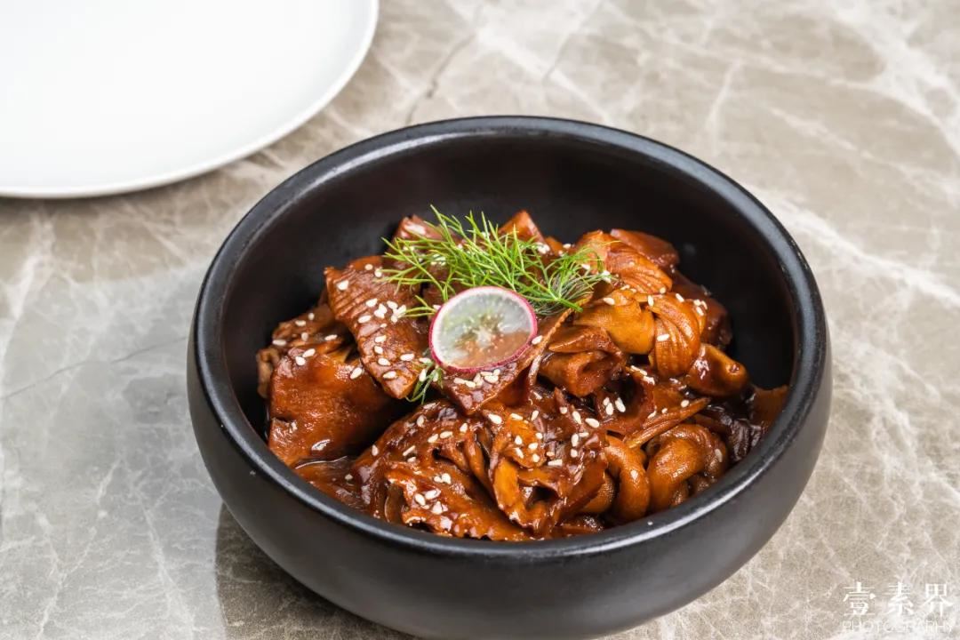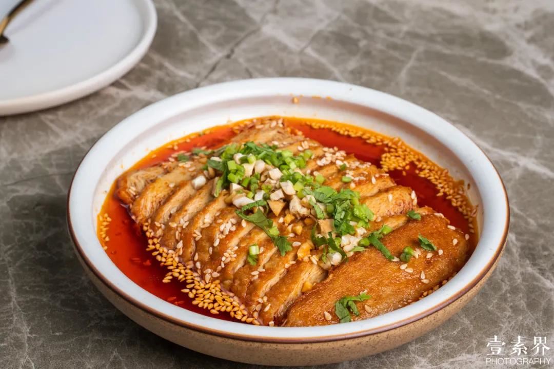 上海有素鸭,我们现在是做成了巴蜀豆衣。采用老上海传统秘制酱汁卤制无添加豆腐衣,自制成素鸭。麻辣调汁仿制川味口水鸡,口味鲜香麻辣,似乎梦幻在成都。