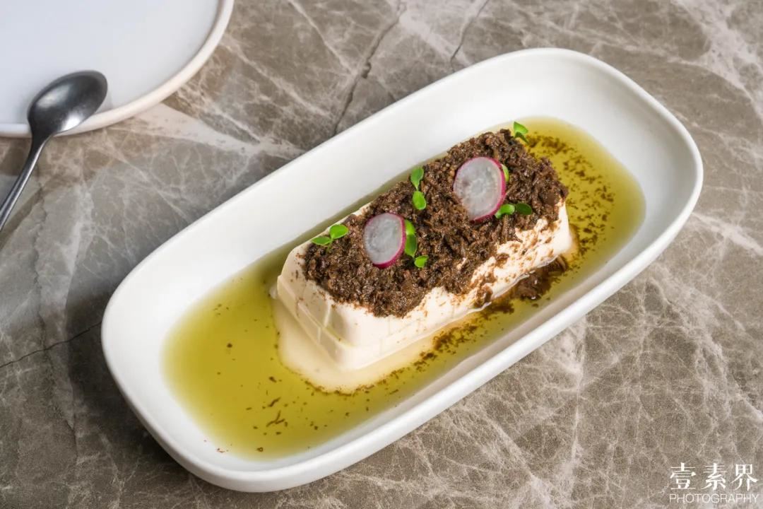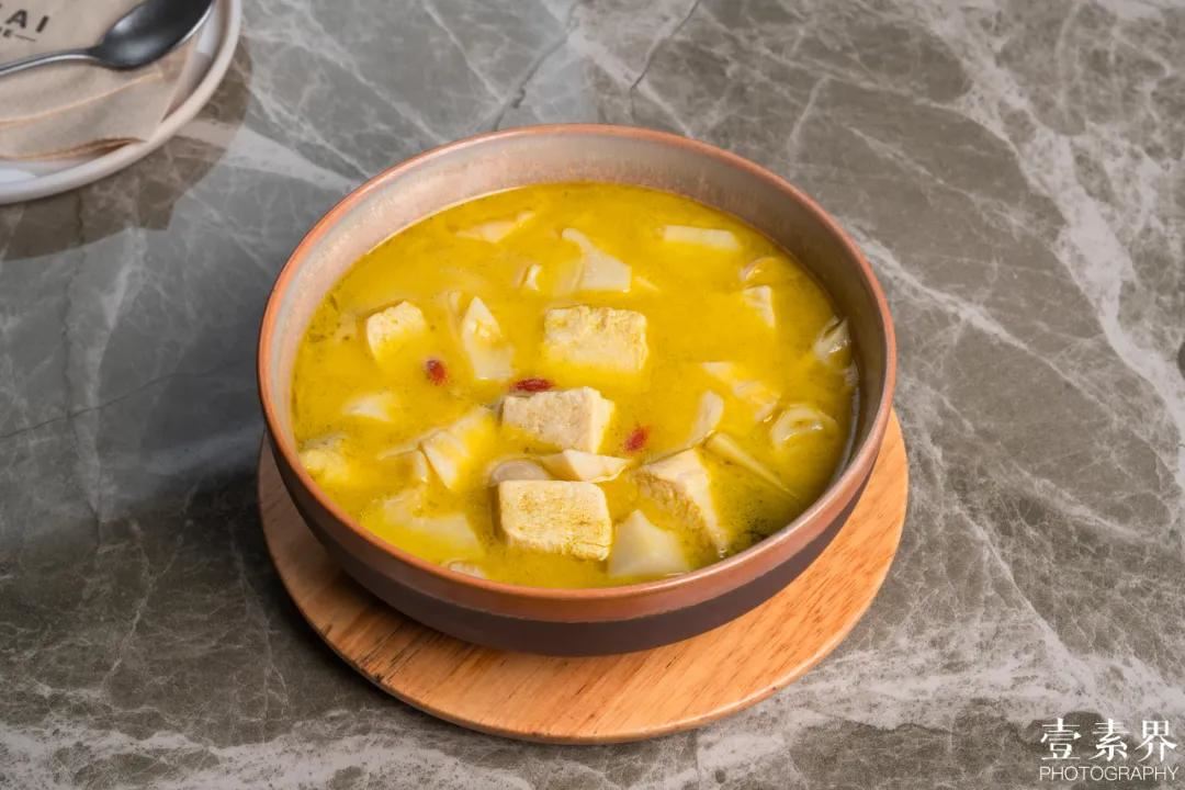 我们的豆腐是传统定制,无添加、非转基因的卤水豆腐,是不用消泡剂的,然后豆腐吃上去也是比较的鲜香。把它冻了以后,就像上海炖鱼汤一样来这个油里过一过,然后清炖没有加任何奶,就像里面有奶一样的白色。