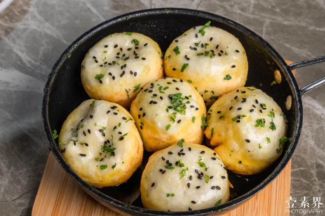 上海的生煎包跟其他地方生煎包是不一样的,其他地方生煎包是直接花纹在上面,但是上海生煎包它是倒过来的,半发半死面就是说吃起来口感皮薄‘肉’多,能吃到地道的上海风味。
