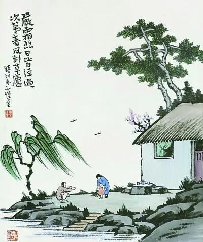 先生的画集《古诗新画》,在艺术上可谓达到最高水准。当然,这也经日益精进之过程。初有完全以古诗写古意者,如为国画,就笔墨而言,并无墨分五色之妙,可谓有笔无墨,但一旦以之为人物的背景,引入诗词,则境界升华。