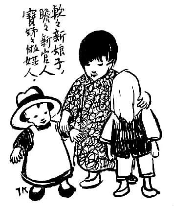 于儿童经验之局限写其心灵之天真,于不起眼的、平常人视之无所谓的现象中发现童心之美。还有一幅令人印象深刻,三个孩子,一女稍高,立于中,左侧男孩,戴英式礼帽,甚大,右侧女孩,头蒙面布,题曰“软软新娘子,瞻瞻新官人,宝姊姊做媒人”。其事极不现实而孩子极慎重,于儿童显示童心童趣,于画则表现了先生的爱心和幽默。
