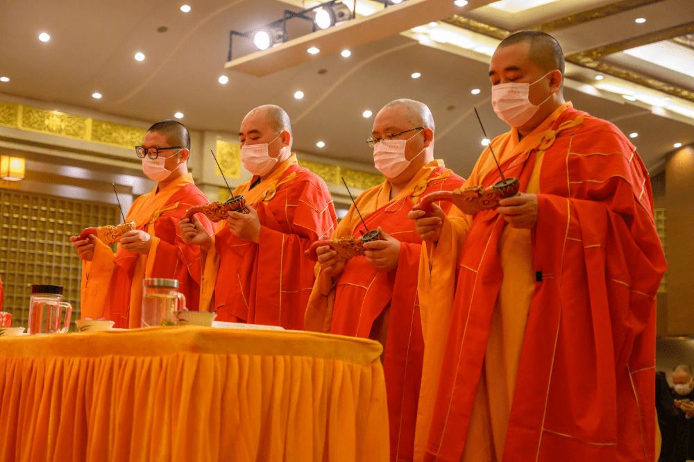 伴随着大悲咒的梵呗声,主法文渊法师手持杨枝净水,依次遍洒清净坛场,以清净身口意三业,虔诚供养药师琉璃光如来,及十方三世一切诸佛菩萨。祈愿法界诸众生,得药师佛十二大愿慈悲加持,无诸疾苦,善愿皆成。