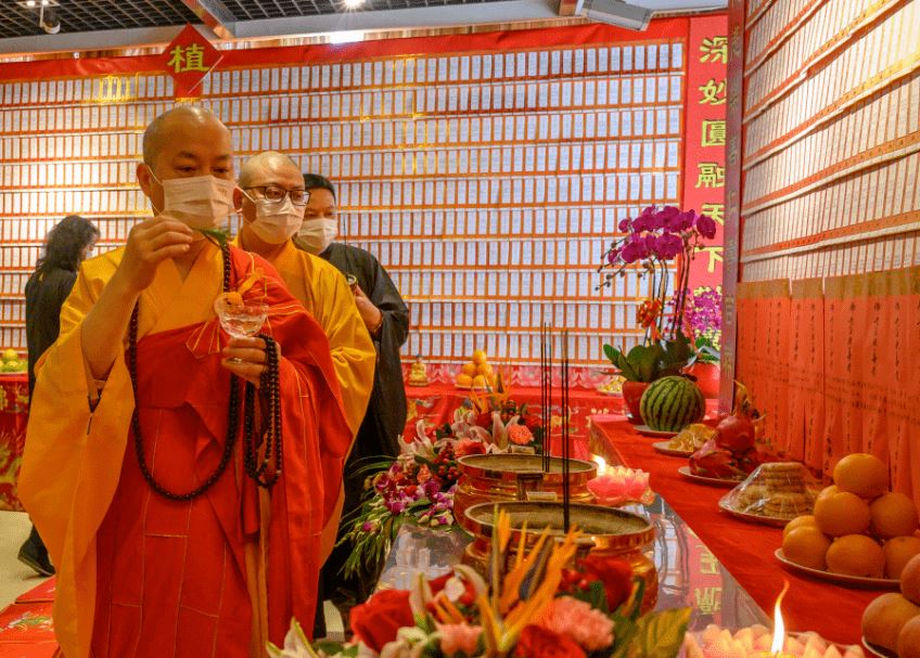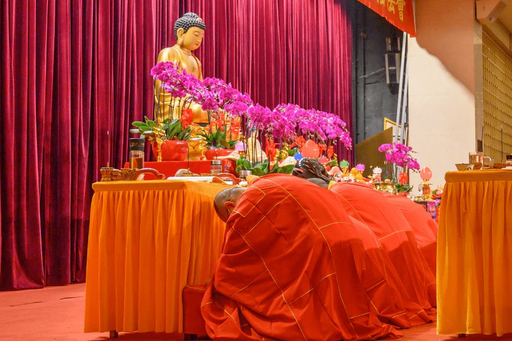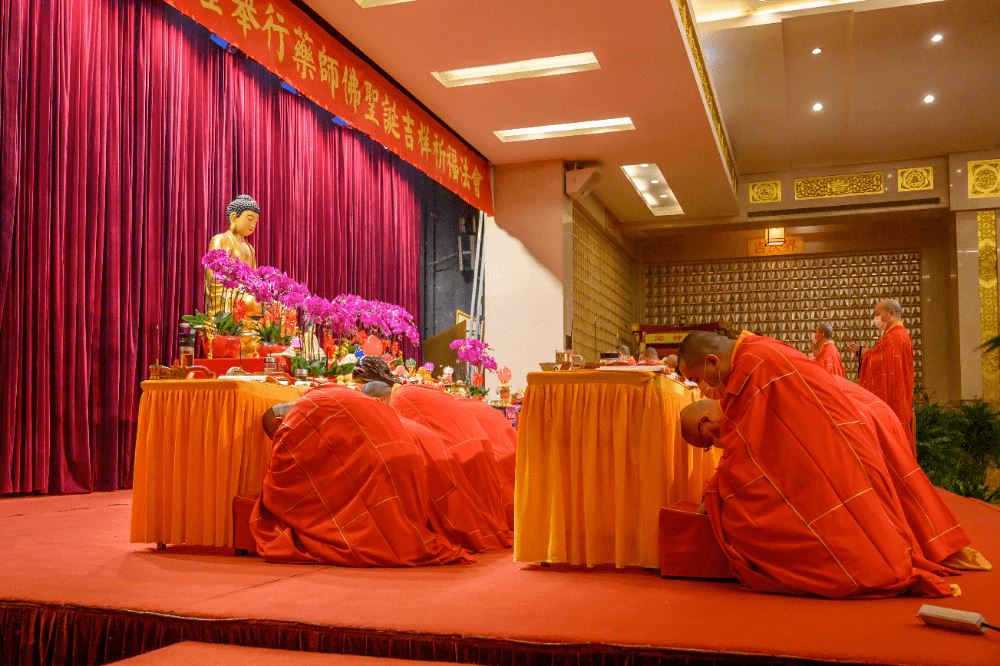 而后,与会大众礼拜《药师忏》,在十方三世一切诸佛菩萨的见证及药师佛本愿的加持下,发自深省种种恶业,承诺不复再犯,令身心重获清净。