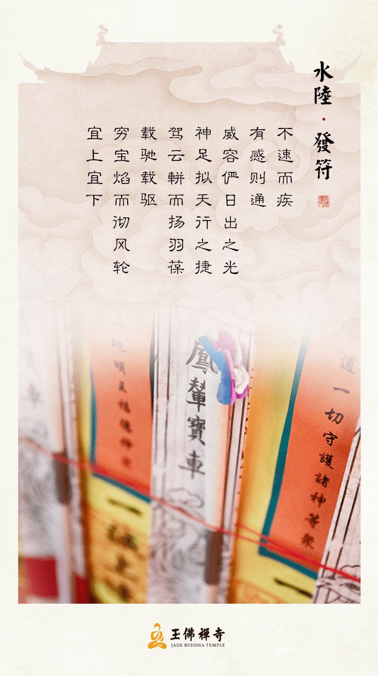 主法法师如法观想,四天捷疾使者、空行捷疾使者、地行捷疾使者、地府捷疾使者及百千诸眷属,依位序立,接受供养,并携“请书”“符牒”及所有内坛功德主的名册,上达天庭、下通地府、昭告人天,禀报在何时何地将举行水陆大法会,希望藉由此“符”,使诸佛菩萨及六道众生都能赴感降临法会。