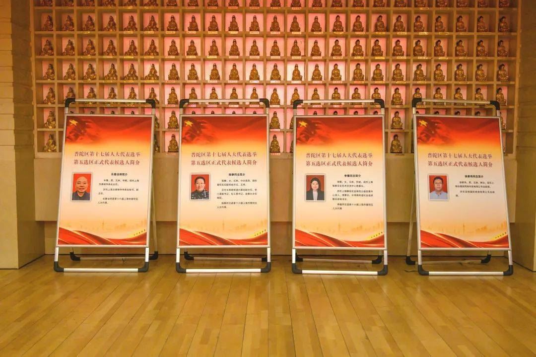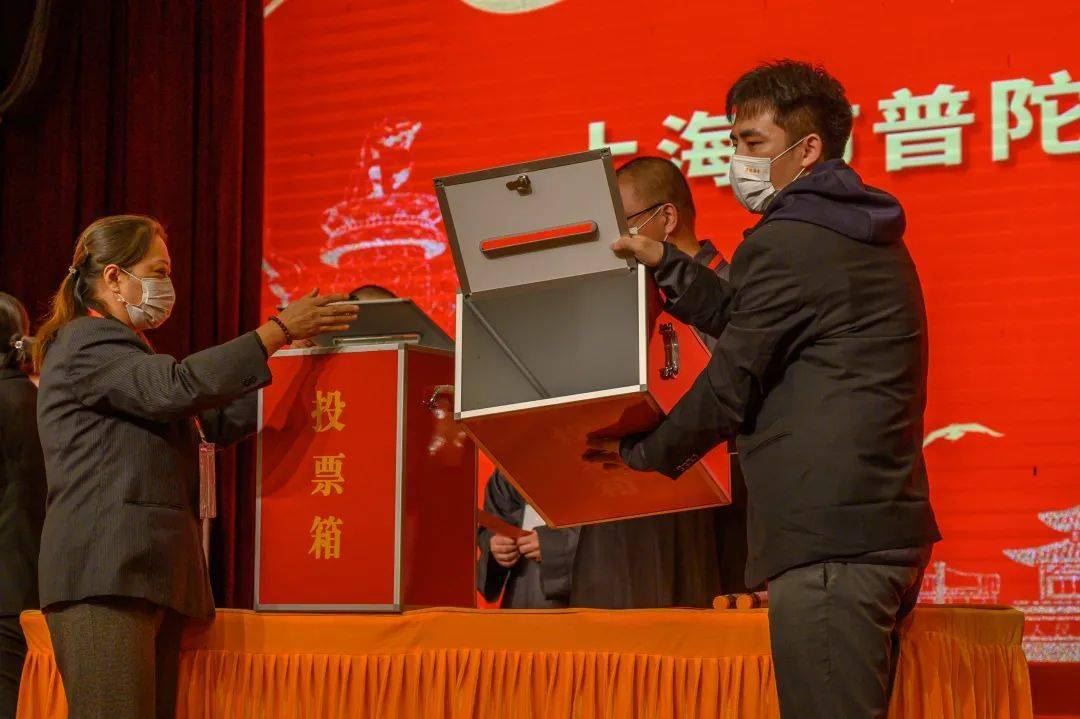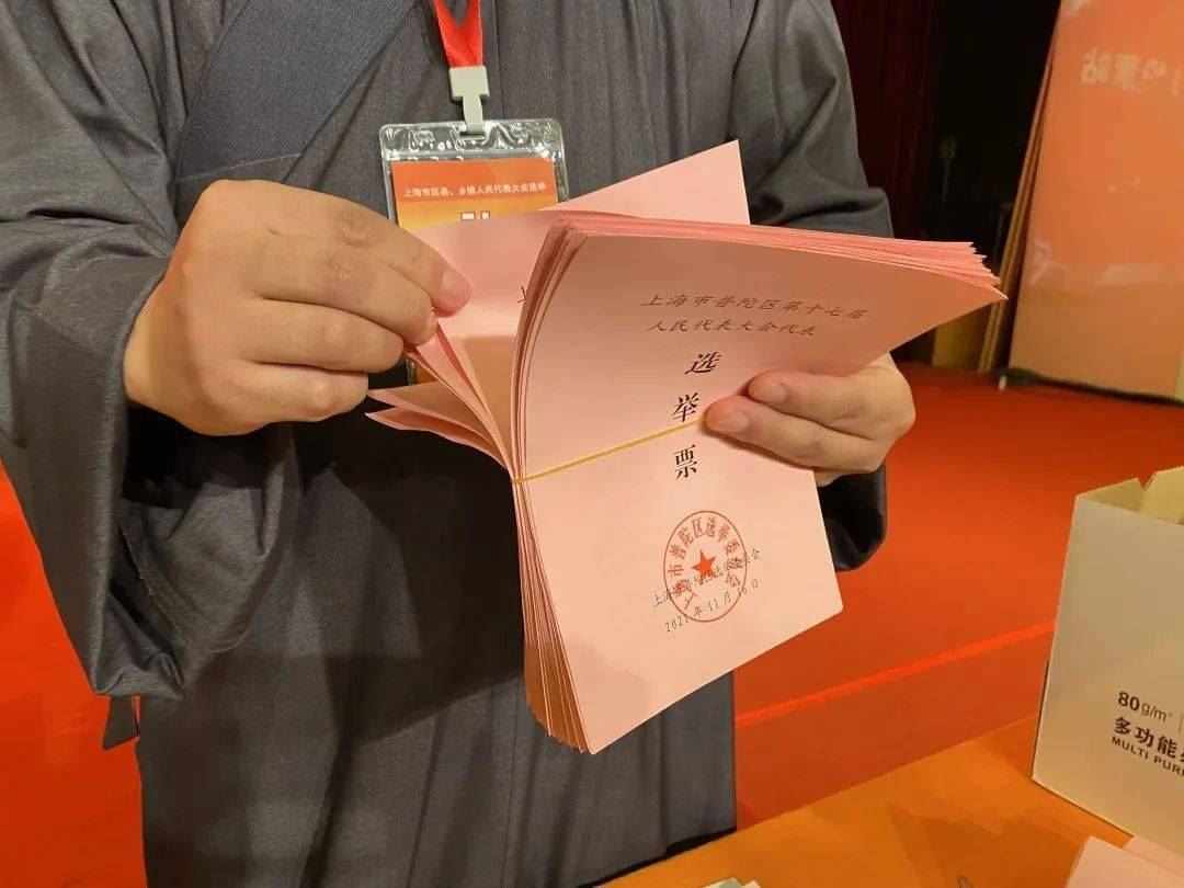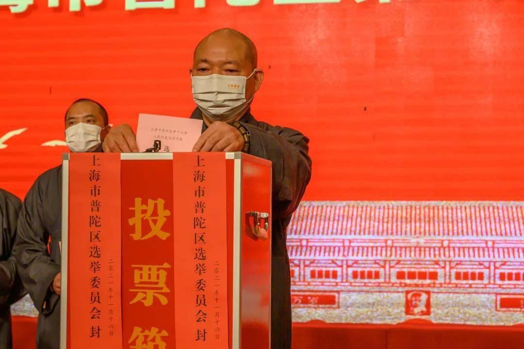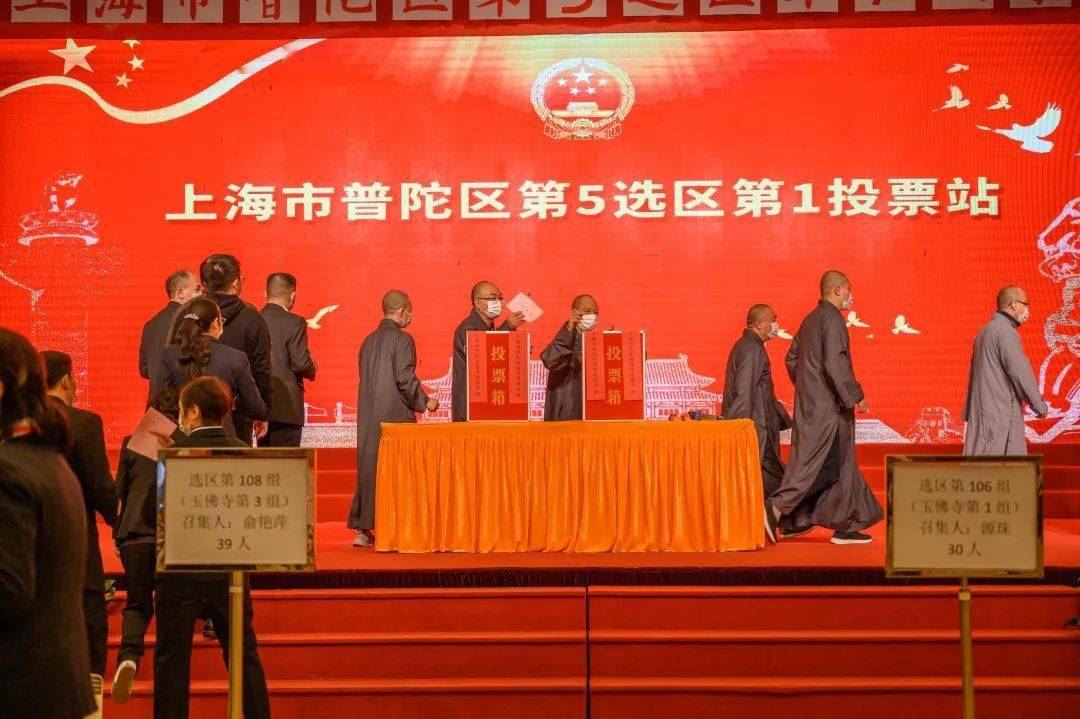 2021年11月16日上午11时30分,267名法师和员工等选民在觉群楼多功能厅参加普陀区第十七届人大换届选举第5选区第1投票站投票,依法行使公民权利,郑重投下自己庄严的一票。