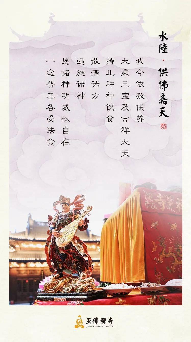 水陆法会第五日清晨,告赦仪式结束后,将举行隆重的供佛斋天仪式。之所以于清晨时分举行斋天,是因为根据诸经典记载,佛陀曾开示诸天饮食的时间是在黎明前、天色未亮前,故于此时进行供养以示尊敬。