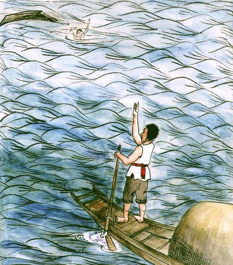 淮南地方有两个人,都是靠着渡船讨生活。一位姓陈,一位姓徐。姓陈的船夫,动作稍微敏捷,所以赚的钱比较多;姓徐的船夫就妒忌他,经常在暗中破坏他船上的器物设备,使他的船不好使用。有一天晚上,姓徐的船夫就秘密地将陈姓船夫的船上的楫桨折断;但是,他怕天亮的时候会被姓陈的发现,于是就开船离开,但在河中却翻了船;姓陈的船夫听到河里有人喊救命,就急着前往救人,但是因为船浆折断,船划不动,只好眼睁睁地看着徐姓船夫被水淹死。