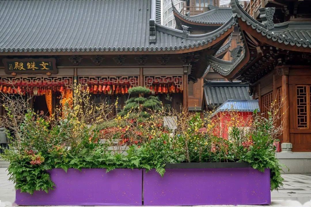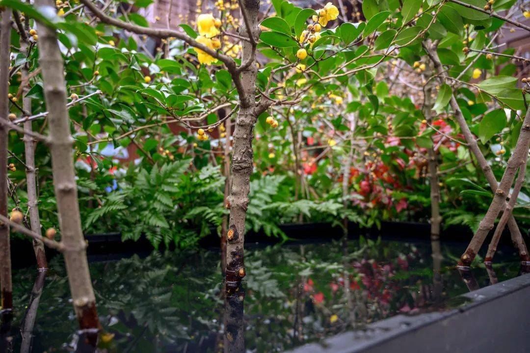 步入大雄宝殿前的广场,即可见到紫色供台上的大型造景作品——金黄色的腊梅林。芬芳的素心腊梅,或含苞待放,或宛然盛开。腊梅林中,还配有红色的蔷薇果,玫红色的茶梅花,以及翠绿的茶梅叶及高山羊齿。