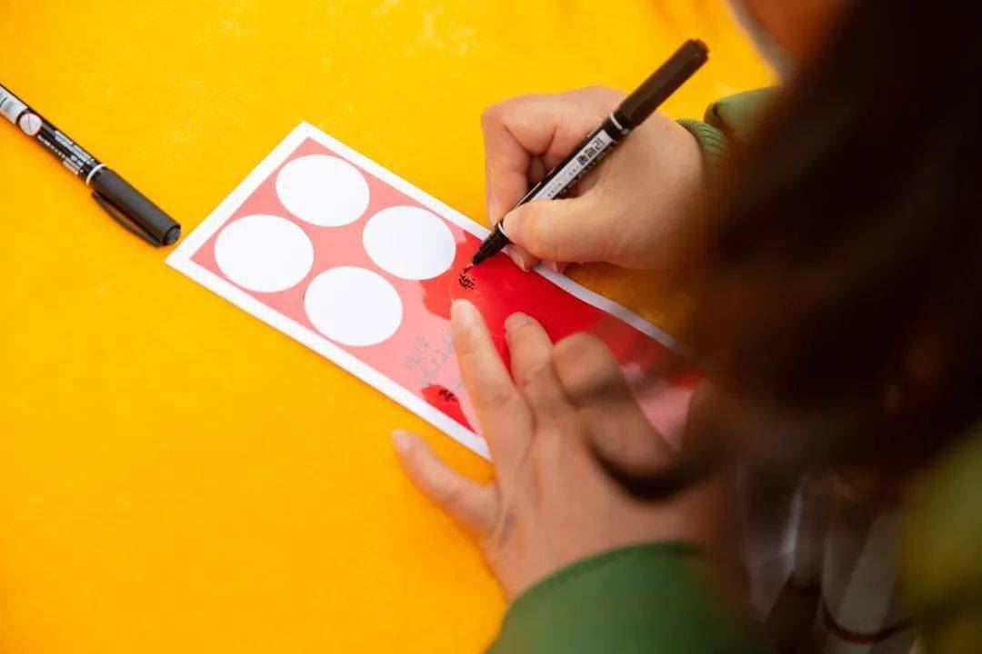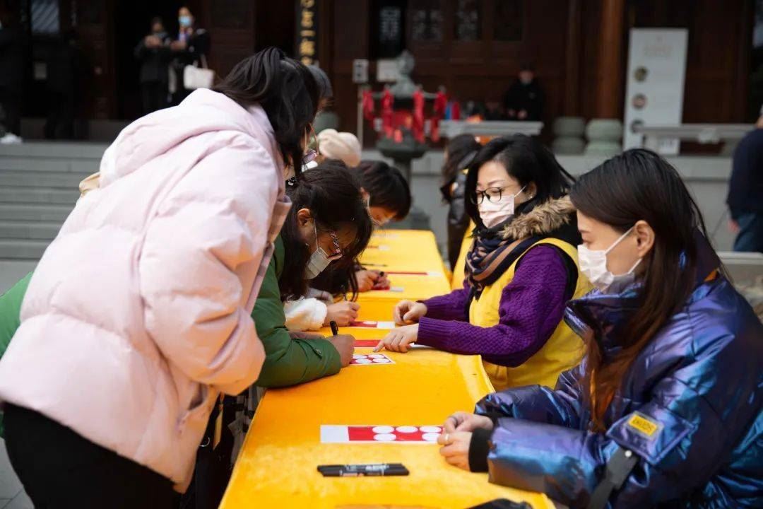另一种互动方式是,在万年宝鼎旁的志工服务台前,有序领取红色小圆片一枚,在圆片上写上祈福者的姓名,贴于供花作品中,随喜供花,为自己或亲友祈福。本次活动共提供10000枚祈福贴纸。