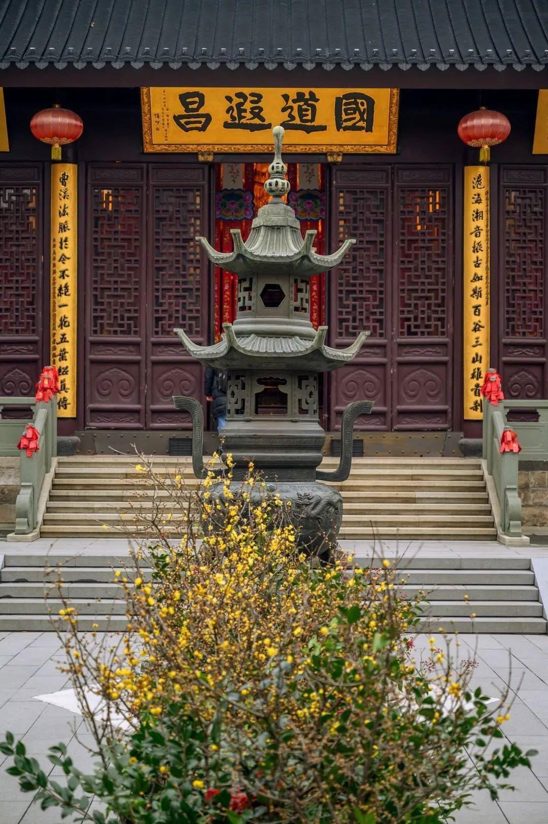 广场后方是观音殿,广场两边分别是文殊殿、普贤殿,三位大菩萨亦能与诸佛一同欣赏这沁人心脾的梅花林。