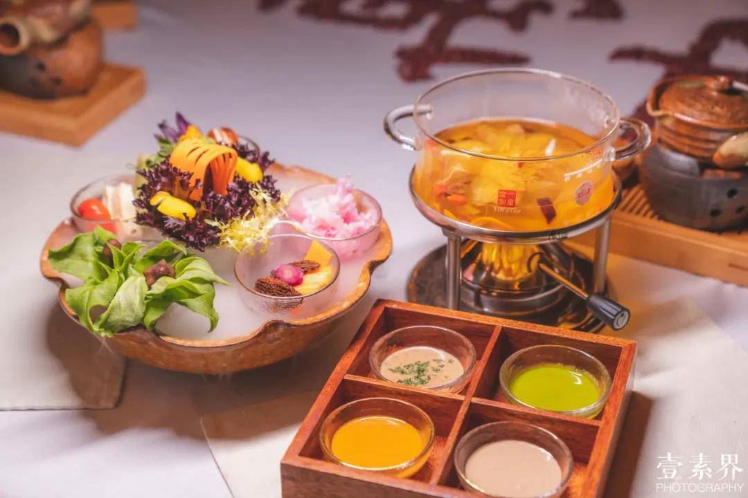 配菜有用火龙果汁染过的绣球菌(粉粉的)、羊肚菌、鸡枞菌、金耳与冰草等鲜美食材。还有老豆腐、莴笋、圣女果、花青素很丰富的观音菜。此外搭配了4款自制酱料:西兰花蔬菜酱、芝麻杏仁酱,木浆子酱和沙拉酱。