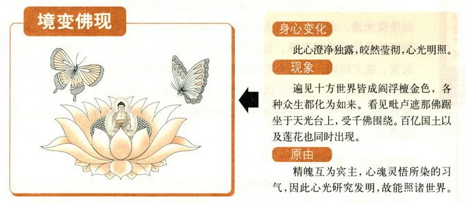 又以此心。澄露皎彻。内光发明。十方遍作。阎浮檀色。一切种类。化为如来。于时忽见。毗卢遮那。踞天光台。千佛围绕。百亿国土。及与莲华。俱时出现。此名心魂。灵悟所染。心光研明。照诸世界。暂得如是。非为圣证。不作圣心。名善境界。若作圣解。即受群邪。